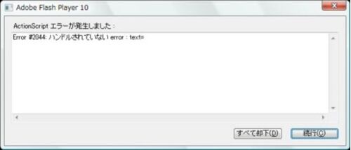 Flex3開発環境導入以降、Flash Playerが関連するURLをブラウザで起動する度に以下のエラーが出るようになってしまいました。 Error #2044: ハンドルされていない error : text= Flex3導入による上記エラーメッセージで調べてみても中々コレと言った解決策が…