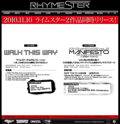 RHYMESTER オフィシャルサイト シングル『WALK THIS WAY』、DVD『King Of Stage Vol.8』を2010/11/10(水)に同時リリース。どちらも初回特典付・副音声有りとなっております。さすがにDVD初回特典(R-20)には副音声は付いてないか?(笑)『WALK THIS WAY』って…